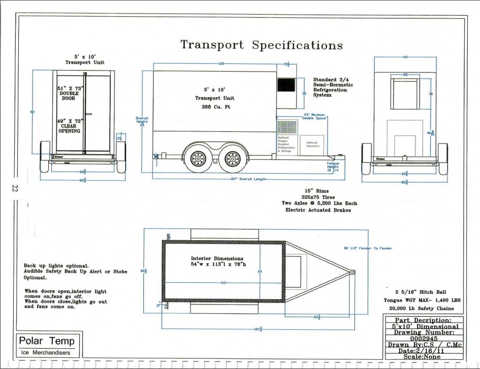 Refrigerated Cargo Trailer. Safely and conveniently haul refrigerated ice transports with this Polar Temp 5X10TT trailer! Designed to hold a 5' x 10' unit, this trailer allows you to securely move units between destinations when making deliveries or transporting orders. Its axle system is extremely safe, featuring springs and equalizers to aid in keeping all four tires in contact with the road at all times, while also including electric brakes. Each of its two axles has a capacity of 5,200 lb. This trailer comes with 225/75/R15 tires on 15" rims, and the steel belt tires are used to match trailer capacity and help eliminate sway.